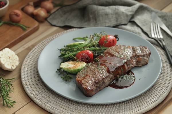 2. 채끝과 가니쉬 야채를 얹어 280도에서 10분 구워준다.