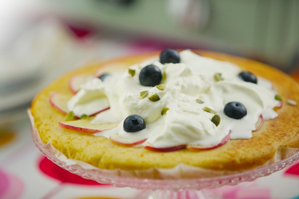 팬케이크가 식으면 위에 생크림과 과일, 호박씨 등으로 장식하여 완성한다.