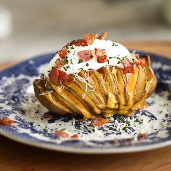 6.​구운감자에 플레인요거트를 올리고, 베이컨칩과 파슬리가루를 뿌려주세요.